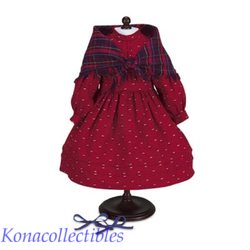 Mrs. Larson might have made Kirsten's red print school dress out of leftover material from her own dress. Since girls didn't wear jackets, Kirsten has a plaid shawl that you can wrap around her so she won't get cold on her long walk to school. Her outfit includes dark blue woven hair ribbons.