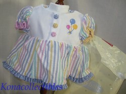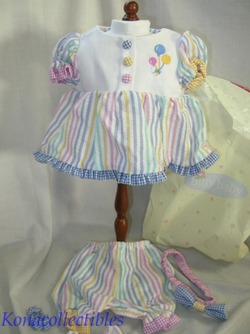 Here's a long retired outfit from American Girl Pleasant Company called Circus Outfit. It is a darling gingham striped dress with matching ruffled undies, darling little booties and a matching headband. Bitty Bear gets his own headband too! It comes with an adorable pop-up book that will sure to make your little one giggle with delight. This is an early Bitty Baby outfit that is not to be missed. It is new but I'm afraid the bag is disintegrating.