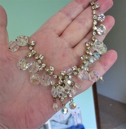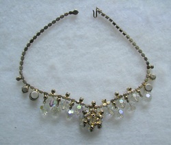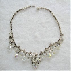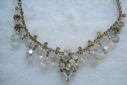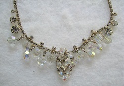 Verified(confirmed authentic D&E) DeLizza & Elster/D&E/Juliana beaded rhinestone necklace. This is in very good, clean condition. No missing, bad, dull or yellowing stones. No noticeable wear or damage to goldtone frame on front, some minor age wear to finish on back. Measures 15 3/4" with a 1 3/4" center drop. Done with crystal rhinestones and crystal AB beads.