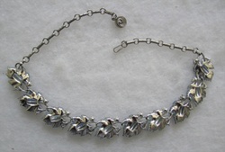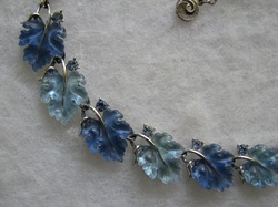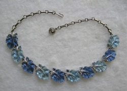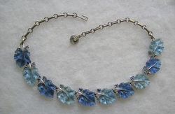 Lisner shades of blue lucite & rhinestone maple leaf necklace. This is in excellent, clean condition. No missing, bad or dull stones (or lucite leaves). No noticeable wear or damage to silver tone frame. Measures 16 3/4" x 7/8".