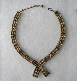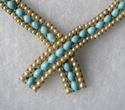Trifari vintage simulated blue turquoise and pearl necklace with crossover design. In excellent, clean condition. No missing, bad or dull stones. No noticeable wear or damage to gold tone frame. Measures about 16" x 1/2" .