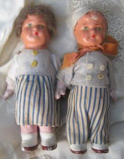 This is the most charming pair! a lovely girl and boy with heart shaped lips and sweet angelic little faces they measure a shade over 6" tall I am not an expert on dolls in any way, shape or form, so, please bear with me! I believe that the heads are celluloid? and the bodies are a painted paper mache obviously, they are the pre-cursors to more modern day plastics the boy has a "Germany" stamp on the bottom of his right shoe they are a little age-worn, but I am leaving them in as-found condition the girl's hair is likely mohair and the back of her head is bald they have some minor paint loss, nothing terrible, you can see the worst of it is on the boy's hairline they have a little surface dirt, again, nothing terrible they both have a metal piece that comes out of their back, I am not sure if that may have been a winding mechanism for their arms to move originally or if it was meant to work with a stand... you know better than I do -- and if you wish to share your knowledge, please drop me a line They are most pleasing to the eye, and I am guessing that they pre-date WWII Thanks for looking and please feel free to ask any questions!