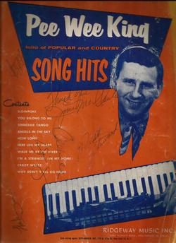 Pee Wee King Folio of Popular & Country Song Hits Signed by multiple people, including Pee Wee King, Redd Stewart, Donnie White, "Don", and another person, June or Jim Mc something, I cannot make out the name some of the signatures are smeared vintage songbook published by Ridgeway Music, Inc.