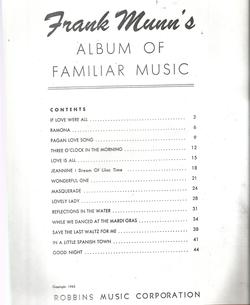 Frank Munn's Album of Familiar Music Vintage 1945 Songbook published by Robbins Music Corporation 47 pages Cover has age wear, spine wear at lower section no tears, no writing fair pre-owned condition See my other listings for TONS more music!