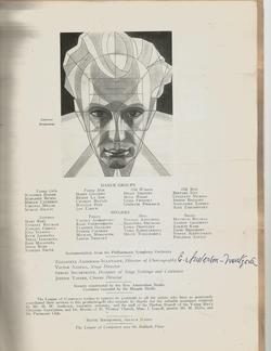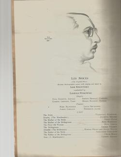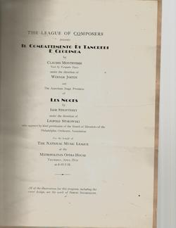 This is a signed program from the April 25, 1929 performance of a double-bill Claudio Monteverdi Il Combatimento Di Tancredi L'Clorinda and Igor Stravinsky Les Noces Presented by The League of Composers for the benefit of The National Music League at the Metropolitan Opera House the program was illustrated by Sergei Soudeikine here is the rundown of the performance: