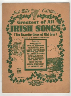 Greatest of All Irish Songs. Ten Favorite Gems of Old Erin. Arr by F. Henri Klickmann. Jack Mills. 25 Pages. 1925 Copyright. Nice Vintage Condition. 16-01