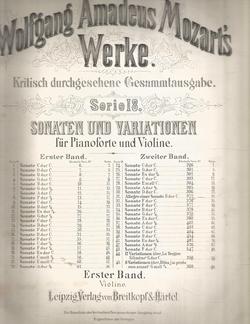 Mozarts Werke. Kritisch durchgesehene Gesammtausgabe . Serie 18 Sonatas and Variations for Piano & Violin Leipzig Breitkopf & Hartel. Plate Nos, W.A.M. ### Book.1 , 179 and 58 Pages. Oversized Score and Violin Part. Both are The Hardcover Editions from 1879? Music is in Excellent Condition, The Piano Score Binding needs to be restored. Nat1&2