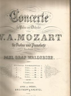 Mozart Violin Concerti Breitkopf & Hartel Hardcover VIOLIN PART ONLY Contains concertos 1-6 for violin & piano, this is the VIOLIN part ONLY edited by Paul Graf Waldersee sold as it is 55 pages very good pre-owned condition age appropriate wear a couple very minor pencil notes here and there dates probably to the late 1800s, early 1900s