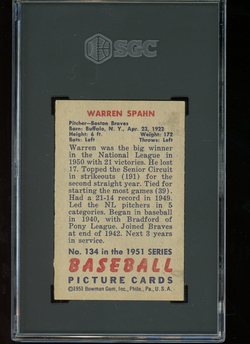 1951 Bowman Baseball Card (#134) of Boston / Milwaukee Braves Hall-of-Fame Pitcher, Warren Spahn. Card is professionally graded 5 EX (Excellent) by SGC.
