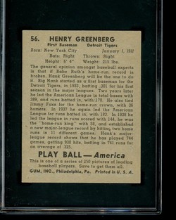 1939 Play Ball Baseball Card (#56) of Detroit Tigers Hall-of-Fame 1st Baseman, Hank Greenberg. Card is professionally graded 6 EX-MT (Excellent to Mint) by SGC.
