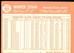 1964 Topps Baseball #400 Warren Spahn Milwaukee Braves HOF