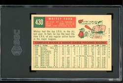 1959 Topps Baseball Card (#430) of New York Yankees Hall-of-Fame Pitcher, Whitey Ford. Card is professionally graded 6 EX-MT (Excellent to Mint) by SGC.