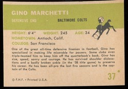 1961 Fleer Football Card (#37) Of Baltimore Colts Hall-of-Fame Defensive End, Gino Marchetti. Card is EX-MT+ with some light corner wear and no creases. No writing, tape stains, pin holes. See scan for centering.
