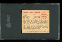1950 Bowman Baseball Card (#77) of Brooklyn Dodgers Hall-of-Fame Outfielder, Duke Snider. Card is professionally graded 6bEX-MT (Excellent to Mint) by SGC.