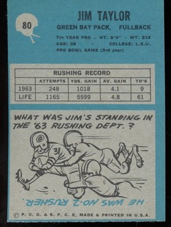 1964 Philadelphia Gum Co. Football Card (#80) of Green Bay Packers Hall-of-Fame Running Back, Jim Taylor.