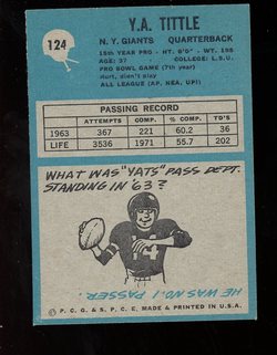 1964 Philadelphia Gum Co. Football Card (#124) of New York Giants Hall-of-Fame Quarterback, YA Tittle.