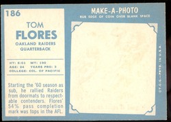 1961 Topps Football Rookie Card (#186) Of former Oakland Raiders Quarterback and Hall-of-Fame Head Coach, Tom Flores.