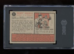 1962 Topps Baseball Card (#5) of Los Angeles Dodgers Hall-of-Fame Pitcher, Sandy Koufax. Card is professionally graded 6 EX-MT (Excellent to Mint) by SGC. .