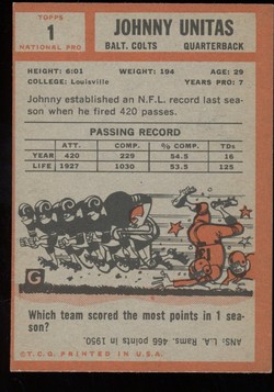 1962 Topps Football #001 Johnny Unitas Baltimore Colts HOF
