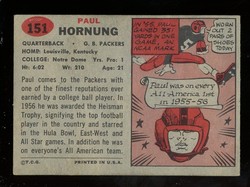 1957 Topps Football Rookie Card (#151) of Green Bay Packers Hall-of-Fame Running Back, Paul Hornung. Card is VG with some corner wear and some surface creases. No writing, pin holes, tape stains. See scan for centering. /span>