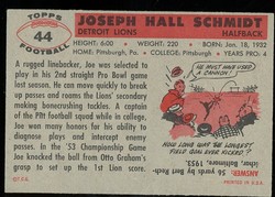 1956 Topps Football Rookie Card (#44) Of Detroit Lions Hall-of-Fame Linebacker, Joe Schmidt.