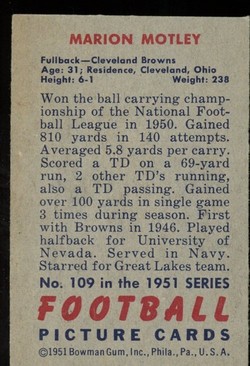 1951 Bowman Football Card (#109) Of Cleveland Browns Hall-of-Fame Running Back, Marion Motley.