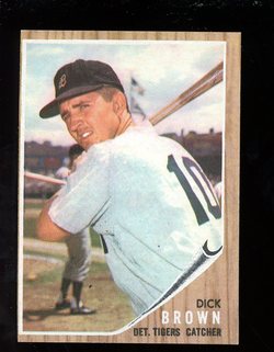 1962 Topps Baseball Card (#438) Of Former Detroit Tigers Catcher, Dick Brown. Card is NM with a touch of corner wear and no creases. No writing, pin holes, tape stains. See scan for centering.