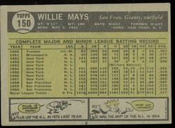 1961 Topps Baseball Card (#150) of San Francisco Giants Hall-of-Fame Outfielder, Willie Mays. Card is VG-EX with some corner wear and a crease along the bottom edge. No writing, pin holes, tape stains. Ding in the lower right corner. See scan for centering.