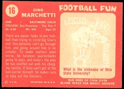 1958 Topps Football Card (#16) Of Baltimore Colts Hall-of-Fame Defensive End, Gino Marchetti.