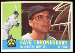 1960 Topps Baseball Card (#9) of Former Washington Senators Outfielder, Faye Throneberry. Card is EX+ with some corner wear and no creases. No writing, pin holes, tape stains. Ding in upper left corner. See scan for centering.
