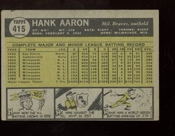 1961 Topps Baseball Card (#415) of Milwaukee Braves Hall-of-Fame Shortstop, Hank Aaron. Card is EX with some corner wear and a corner back crease in the lower right. No writing, pin holes, tape stains. Small ding in the lower left corner. See scan for centering.