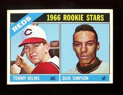 1966 Topps Baseball Cincinnati Reds Rookie Stars Card (#311) Featuring Tommy Helms and Dick Simpson. Card is EX-MT with some corner wear and no creases. No writing, pin holes, tape stains. See scan for centering.