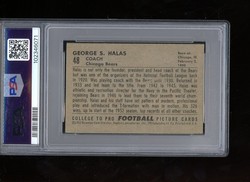 1952 Bowman SMall Football Rookie Card (#48) of Chicago Bears Hall-of-Fame Head Coach, George Papa Bear Halas. Card is professionally graded 5 EX (Excellent) by PSA.