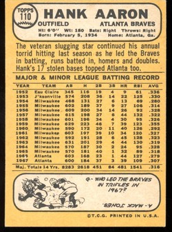1968 Topps Baseball #110 Hank Aaron Atlanta Braves HOF