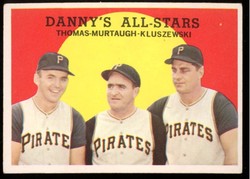 1959 Topps Baseball Danny's All-Stars Card (#17) Featuring Former Pittsburgh Pirates Frank Thomas, Danny Murtaugh and Ted Kluszewski. Card is EX+ with some corner wear and no creases. No writing, pin holes, tape stains. See scan for centering.
