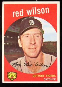 1959 Topps Baseball Card (#24) Of Former Detroit Tigers Catcher, Red Wilson. Card is EX+ with some corner wear and no creases. No writing, pin holes, tape stains. See scan for centering.