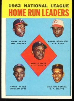 1963 Topps Baseball National League Home Run Leaders Card (#3) Featuring Hall-of-Famers Hank Aaron, Frank Robinson, Willie Mays, Ernie Banks and Orlando Cepeda.