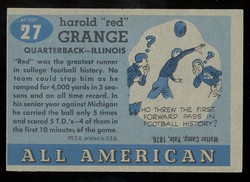 1955 Topps All-American Football Card (#27) of Illinois All-American and Chicago Bears Hall-of-Fame Running Back, Red Grange. Card is EX+ with some corner and no creases. Small surface indentation. See scan for centering.