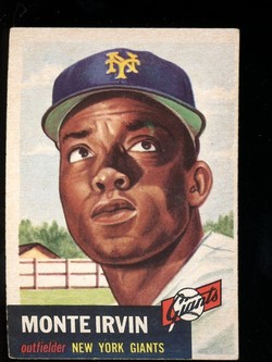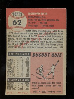 1953 Topps Baseball Card (#062) of New York Giants Hall-of-Fame Outfielder, Monte Irvin. Card is EX-MT with some corner wear and no creases Small ding in the upper right corner. No writing, pin holes, tape stains. See scan for centering.