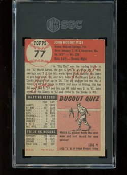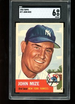 1953 Topps Baseball Card (#077) of New York Yankees / Giants Hall-of-Fame 1st Baseman, John Mize. Card is graded 6 EX-MT (Excellent to Mint) by SGC.