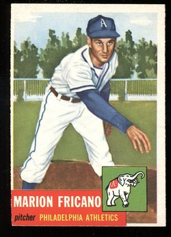 1953 Topps Baseball Rookie Card (#199) of former Philadelphia A's Pitcher, Marion Fricano. Card is EX-MT with some corner wear and no creases. No writing, pin holes, tape stains. Small ding in the lower right corner. See scan for centering.