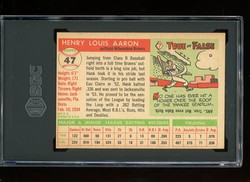 1955 Topps Baseball Card (#047) of Milwaukee / Atlanta Braves Hall-of-Fame Outfielder, Hank Aaron. Card is professionally graded 6.5 EX-MT+ (Excellent to Mint Plus) by SGC.
