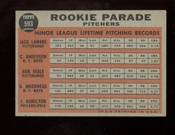 1962 Topps Baseball Rookie Parade High Number Short Print Rookie Card (#593) Featuring Bob Veale (Pirates), Jack Lamabe (Pirates), Craig Anderson (Mets), Bob Moorhead (Mets) and Jack Hamilton (Phillies)