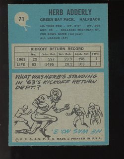 1964 Philadelphia Gum Co. Football Rookie Card (#71) of Green Bay Packers Hall-of-Fame Defensive Back, Herb Adderly.