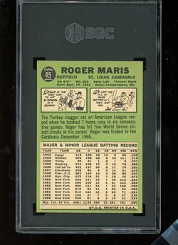 1967 Topps Baseball Card (#45) of former New York Yankees Star Outfielder, Roger Maris. Card is professionally graded 5 EX (Excellent) by SGC.