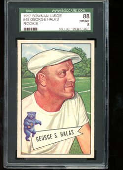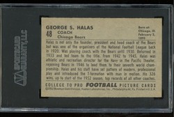 1952 Bowman Large Football Rookie Card (#48) of Chicago Bears Hall-of-Fame Head Coach, George Papa Bear Halas. Card is professionally graded 8 NM-MT (Near Mint to Mint) by SGC.