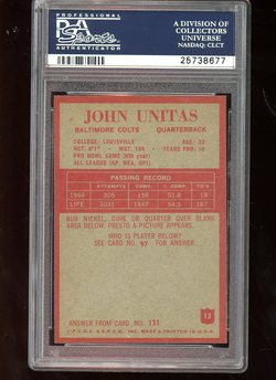 1965 Philadelphia Gum Co. Football Card (#12) of Baltimore Colts Hall-of-Fame Quarterback, Johnny Unitas. Card is professionally graded 7 NM (Near MINT) by PSA.