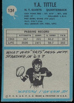 1964 Philadelphia Gum Co. Football Card (#124) of New York Giants Hall-of-Fame Quarterback, YA Tittle.