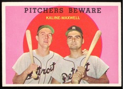 1959 Topps Baseball Pitchers Beware Card (#34) Featuring Former Detroit Tigers Al Kaline and Charlie Maxwell. Card is EX+ with some corner wear and no creases. No writing, pin holes, tape stains. See scan for centering.