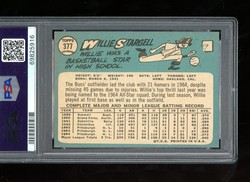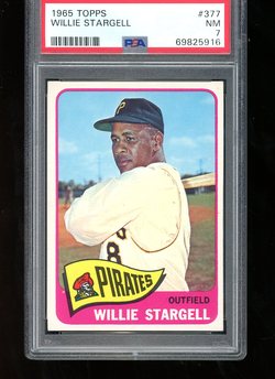 1965 Topps Baseball Card (#377) of Pittsburgh Pirates Hall-of-Fame Outfielder, Willie Stargell. Card is graded 7 NM (Near Mint) by PSA.